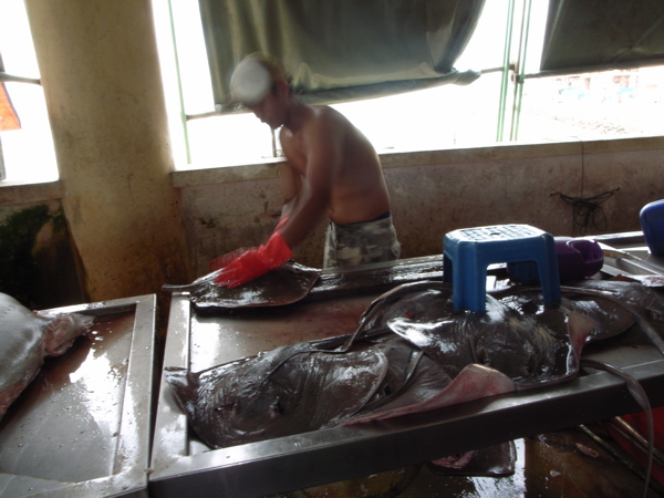 建物の1Fは新鮮な野菜や魚がずらりと並んでいて、エイの解体ショウが見れたり、